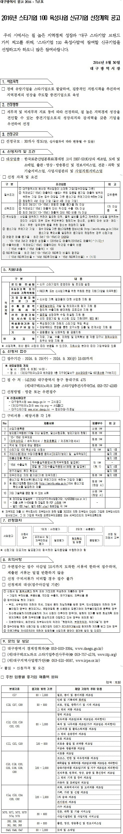 | 제목 | [대구시] 2016년 스타기업 100 육성사업 신규기업 선정계획 공고 | ||||