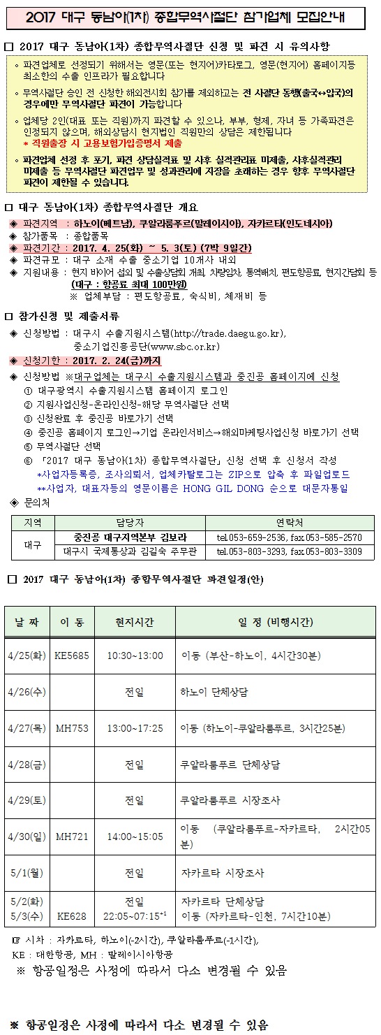| 제목 | [중소기업진흥공단] 2017 대구 동남아(1차) 종합무역사절단 참가업체 모집안내 | ||||