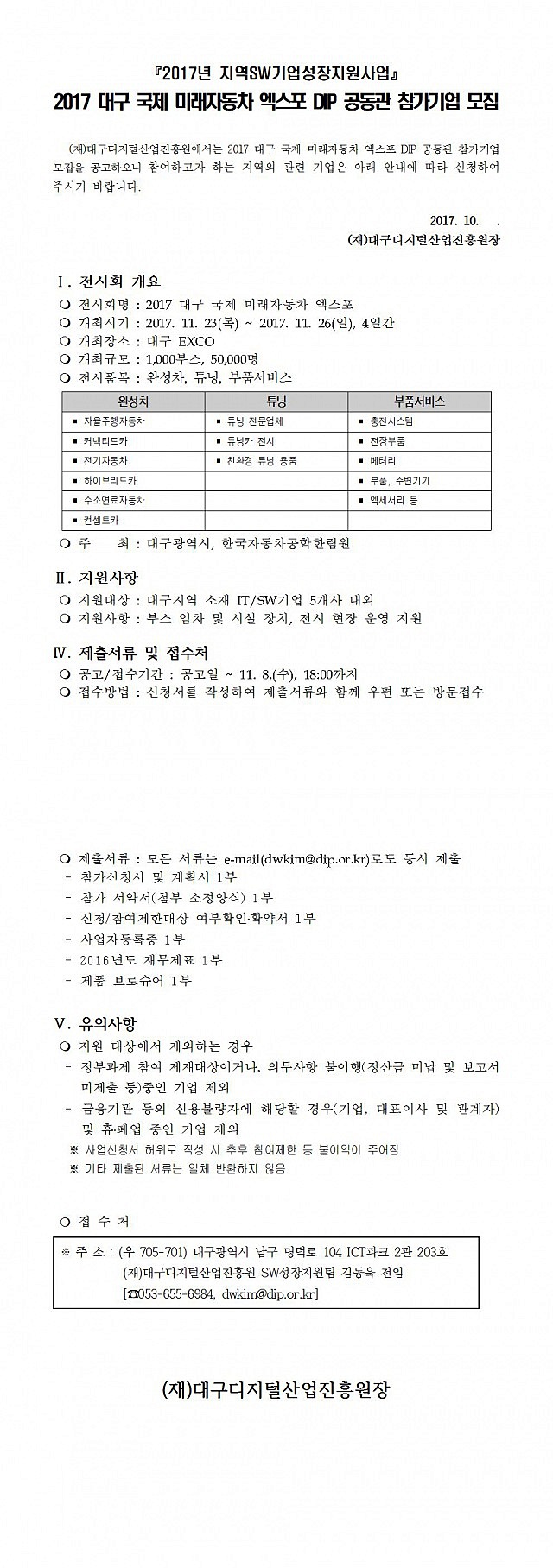 | 제목 | [(재)대구디지털산업진흥원] 2017 대구 국제 미래자동차 엑스포 DIP 공동관 참가기업 모집 공고 | ||||