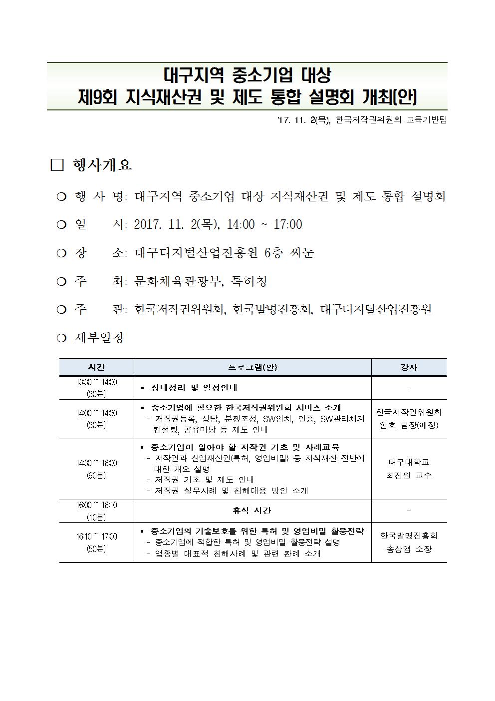 제9회 지식재산권 및 제도통합 설명회 개최(안)_공개.hwp