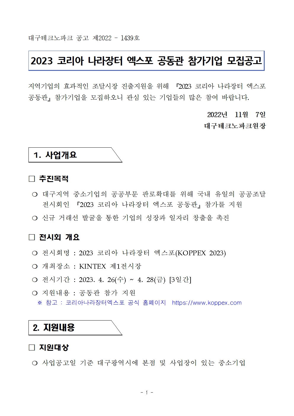 | 제목 | 『2023년 나라장터엑스포 공동관 』 참여기업 모집공고 | ||||