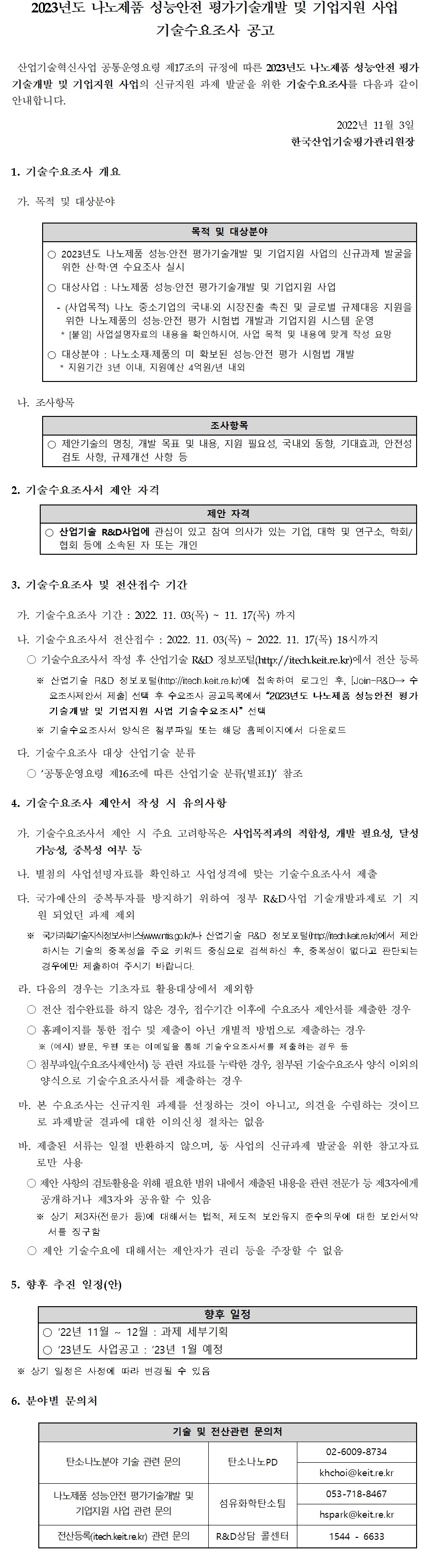 | 제목 | [KEIT] 2023년도 나노제품 성능안전 평가기술개발 및 기업지원 사업 기술수요조사 공고 (~11/17) | ||||