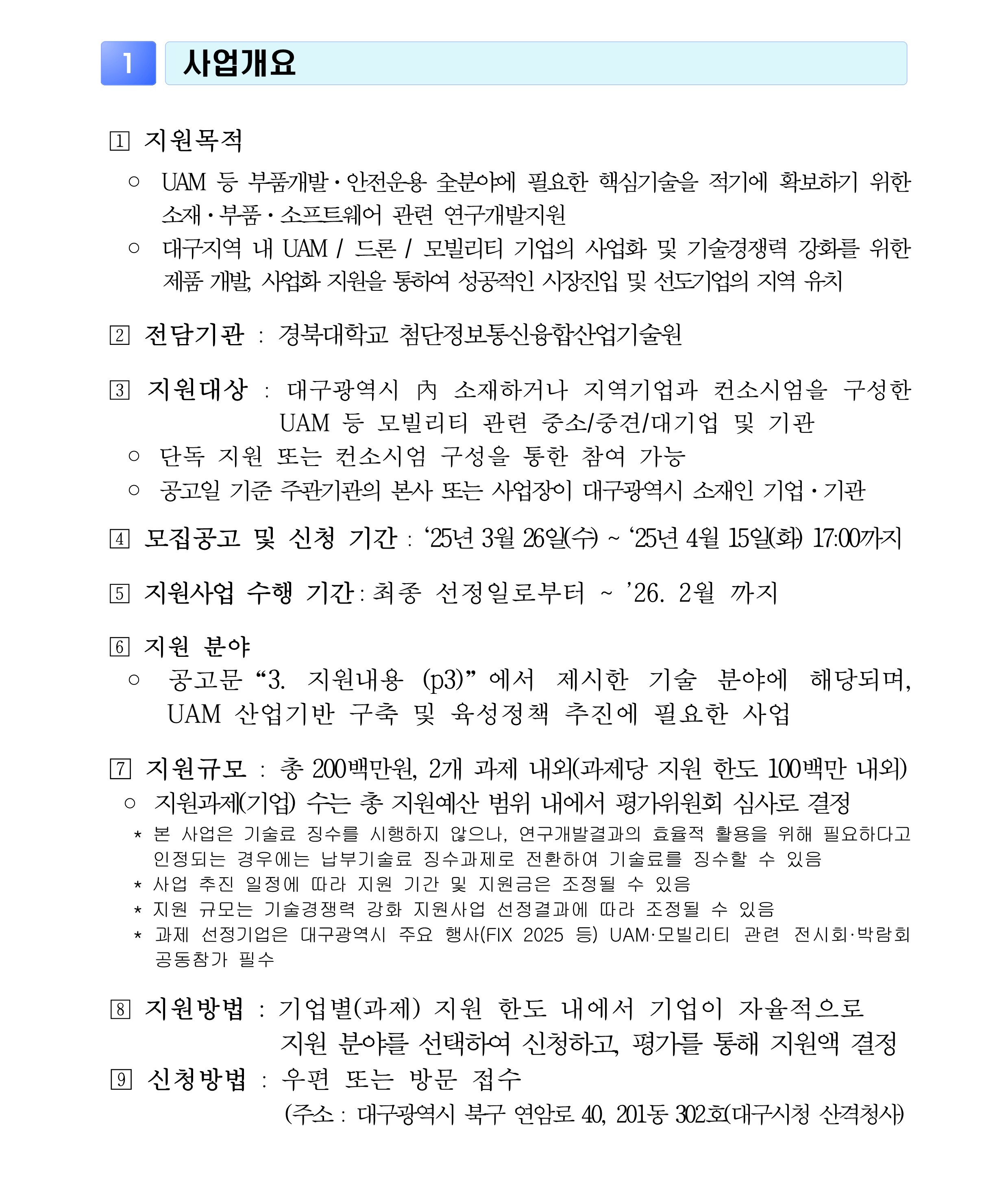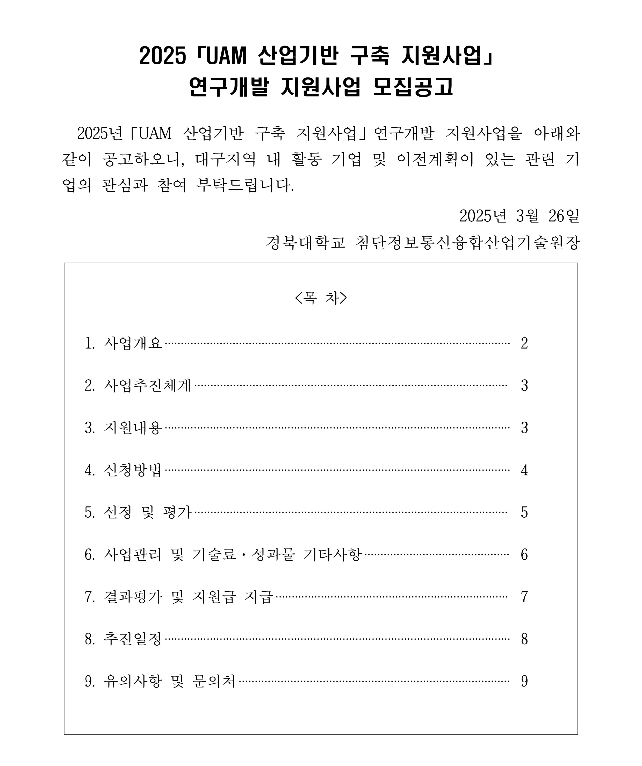 | 제목 | [첨단정보통신융합산업기술원] 2025「UAM 산업기반 구축 지원사업」 연구개발 지원사업 모집공고 (~4/15) | ||||