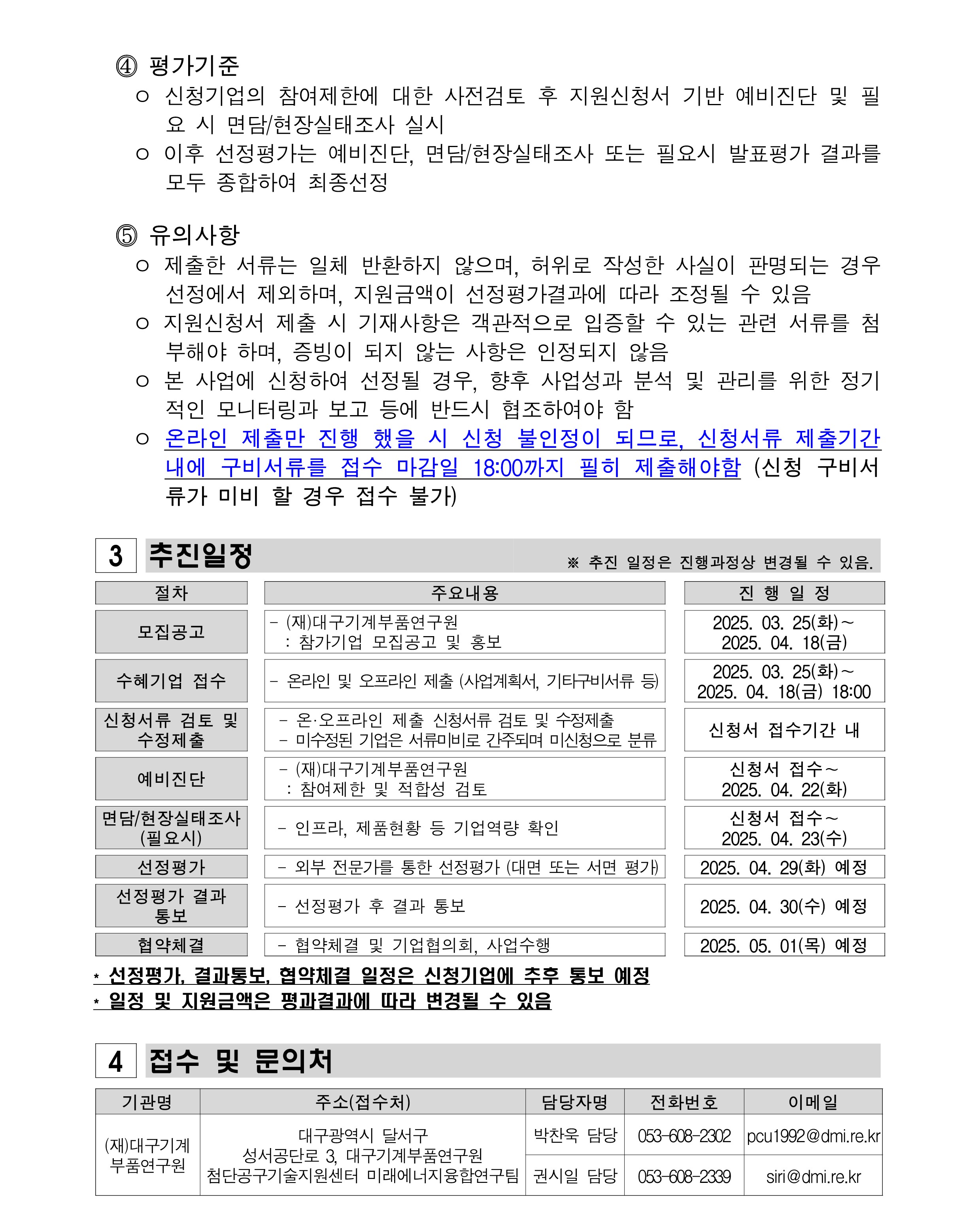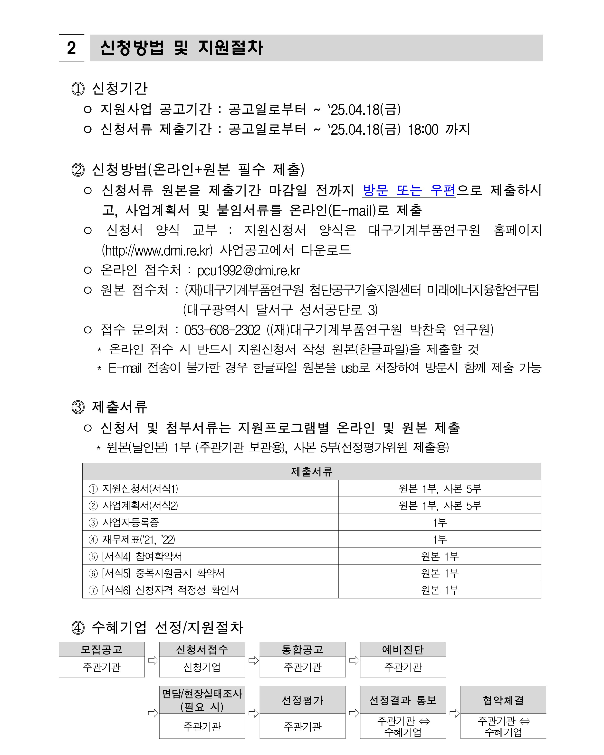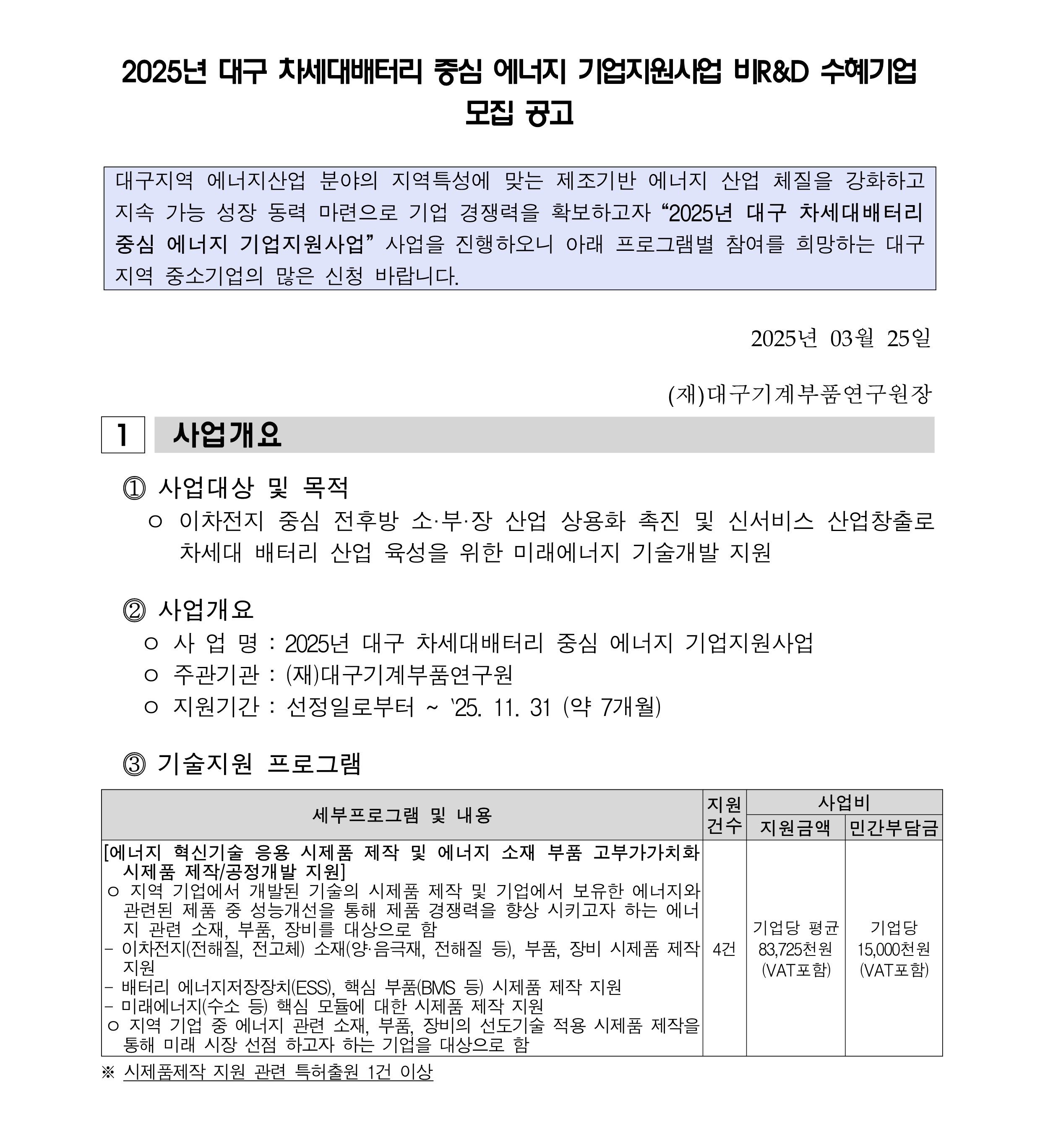 | 제목 | [대구기계부품연구원] 2025년 대구 차세대배터리 중심 에너지 기업지원사업 비R&D 수혜기업 모집 공고 (~4/18) | ||||