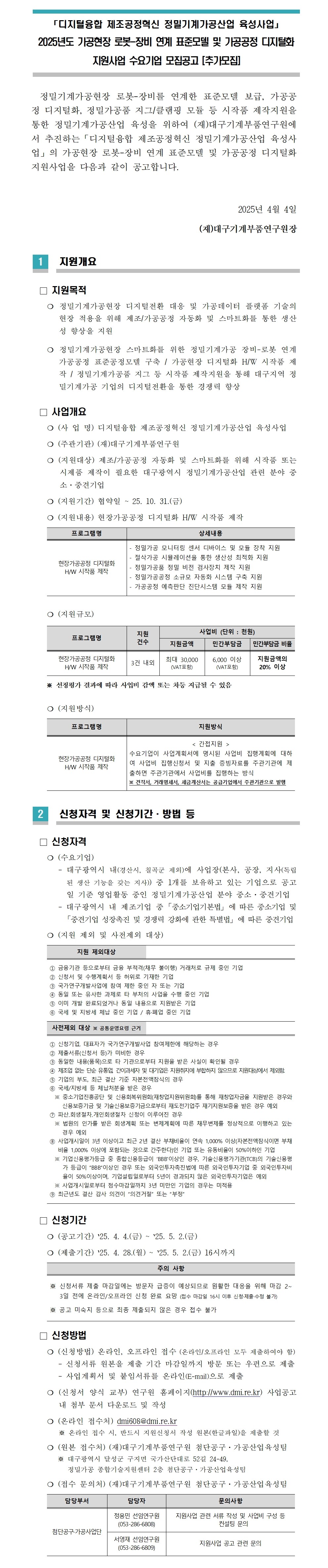 | 제목 | [(재)대구기계부품연구원] 가공현장 로봇-장비 연계 표준모델 및 가공공정 디지털화 지원사업 수요기업 추가모집 (~5/2) | ||||
