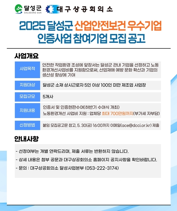 [대구상공회의소] 2025 달성군 산업안전보건 우수기업 인증사업 참여기업 모집 (~5/30)