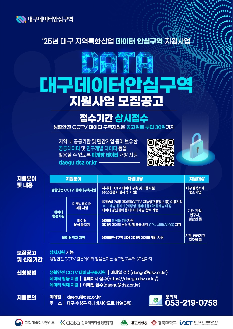| 제목 | [첨단정보통신융합산업기술원] 대구데이터안심구역 이용 지원사업 모집 (상시) | ||||