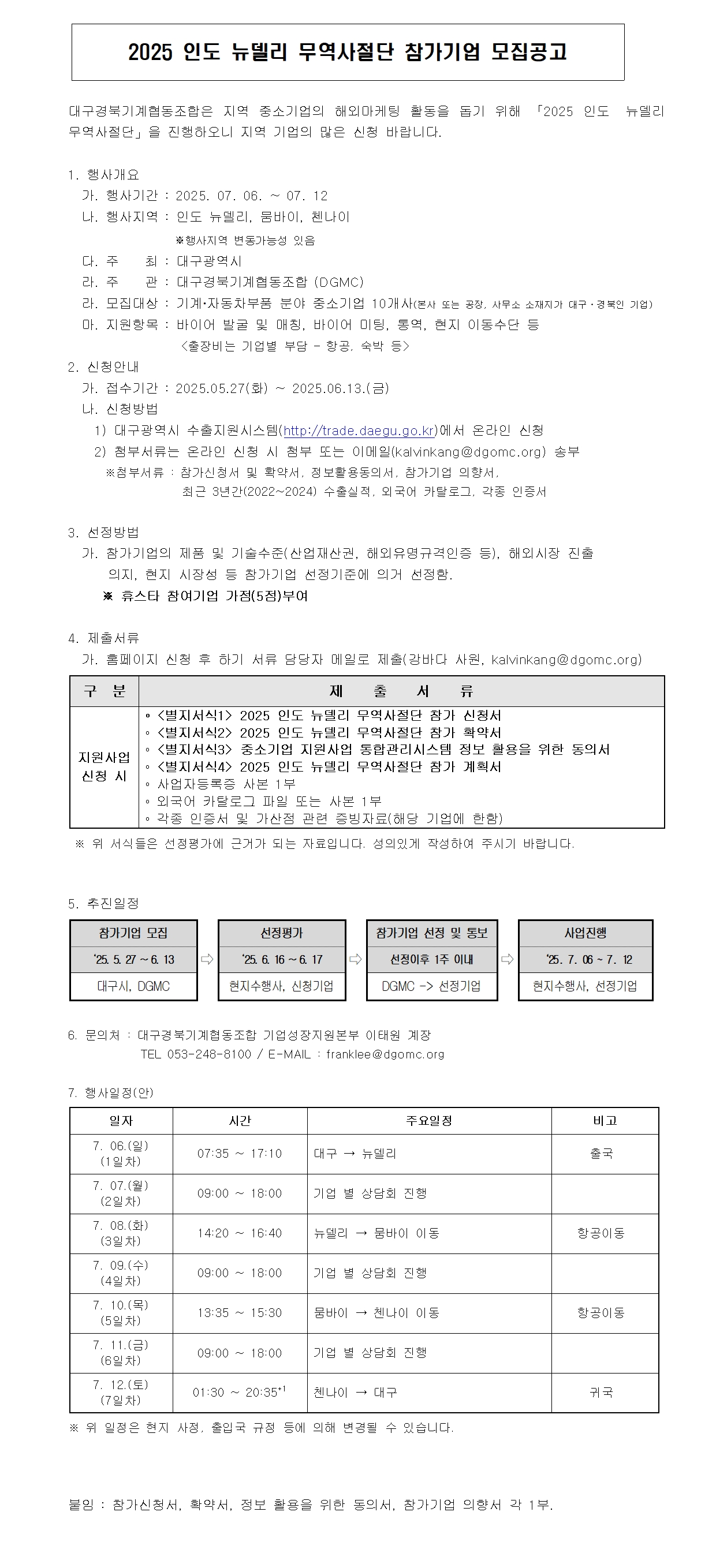 [대구경북기계협동조합] 2025년 인도 뉴델리 무역사절단 참가기업 모집 (~6/13)