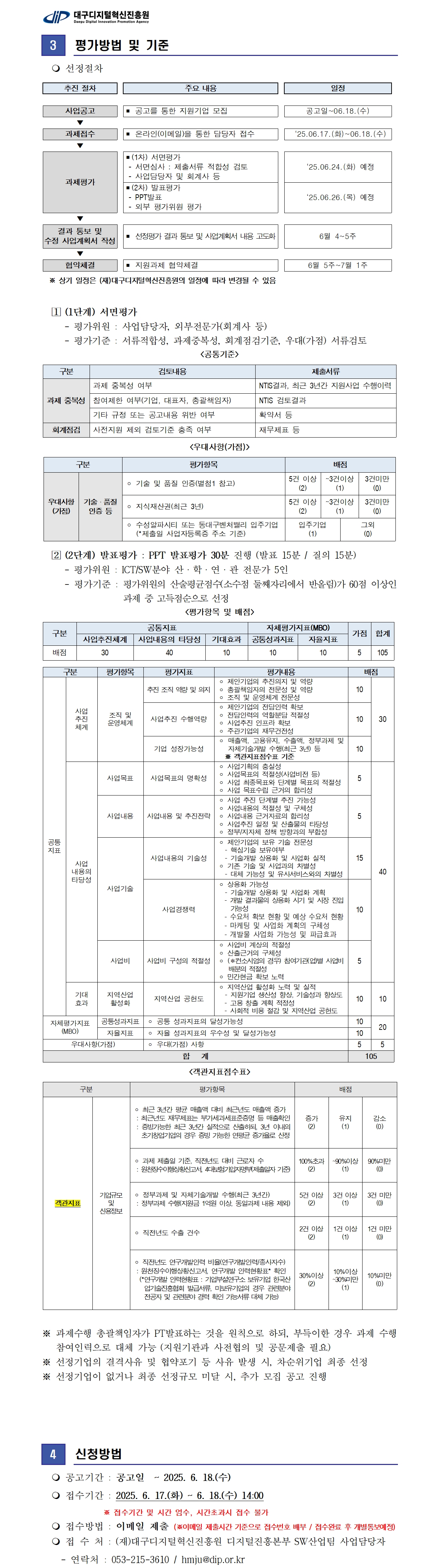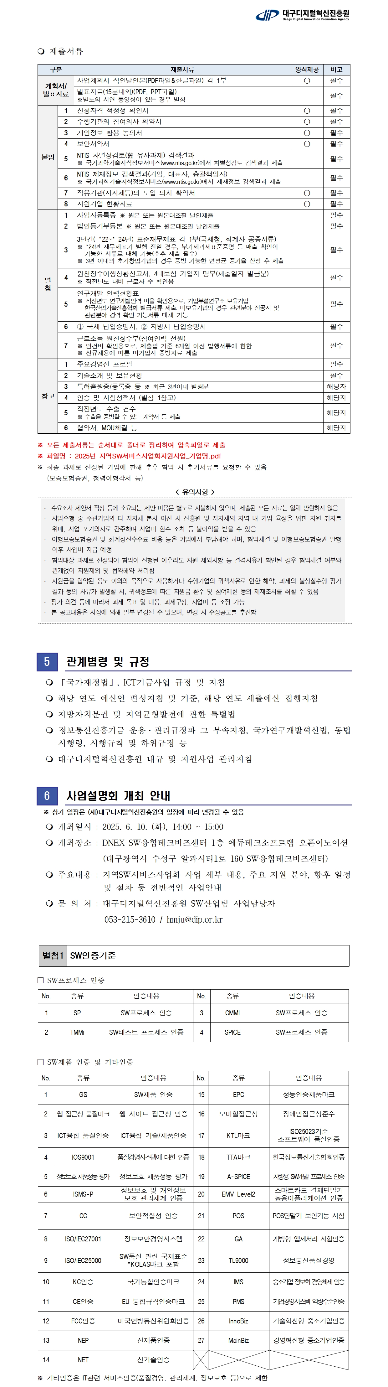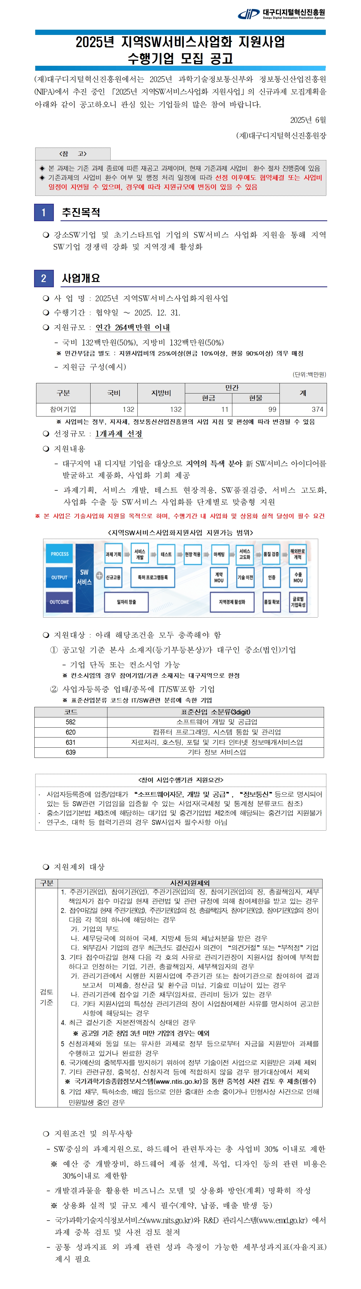| 제목 | [대구디지털혁신진흥원] 2025년 지역SW서비스사업화 지원사업 수행기업 모집 (~6/18) | ||||