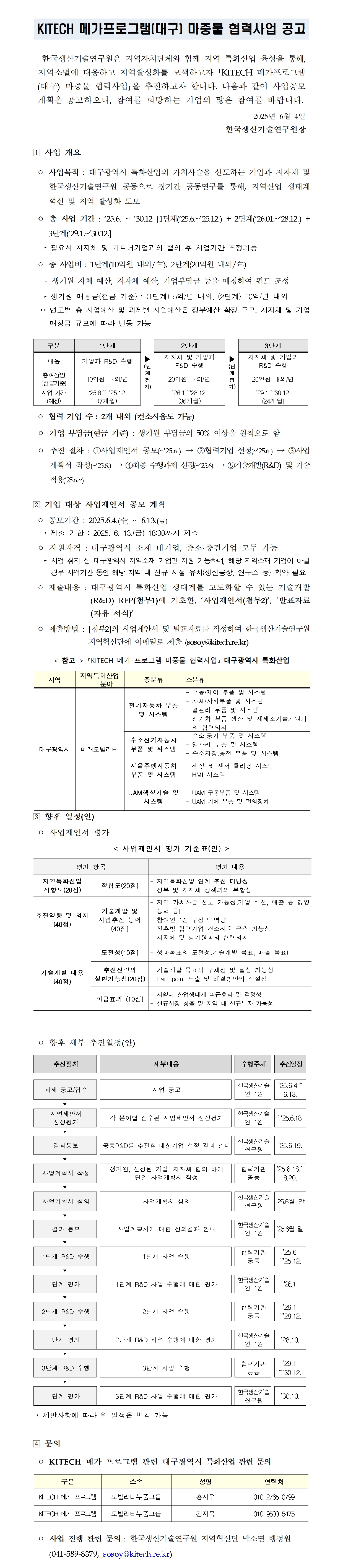 | 제목 | [한국생산기술연구원] KITECH 메가프로그램(대구) 마중물 협력사업 공고 (~6/13) | ||||