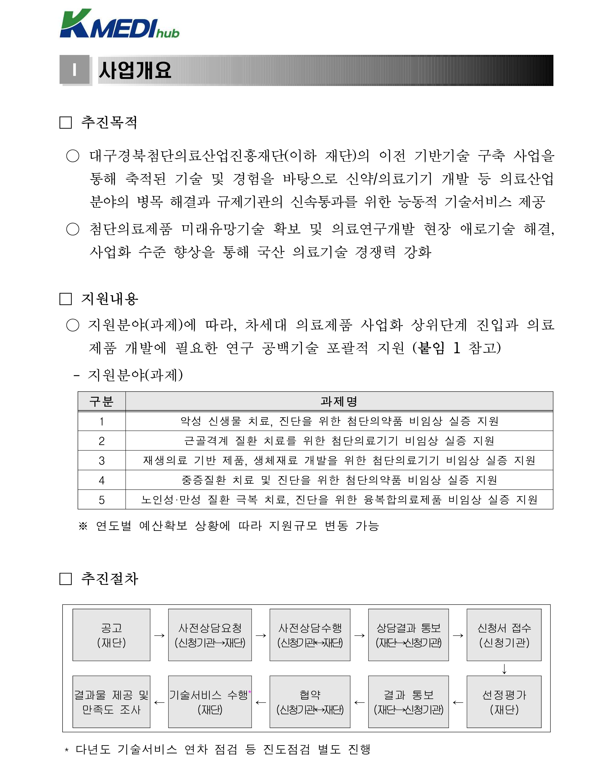 | 제목 | [대구경북첨단의료산업진흥재단] 2025년도 제1차 첨단의료산업선도기반실증지원사업 ‘혁신·융복합·의료제품 개발 비임상 현장 실증’ 공고 (~7/8) | ||||