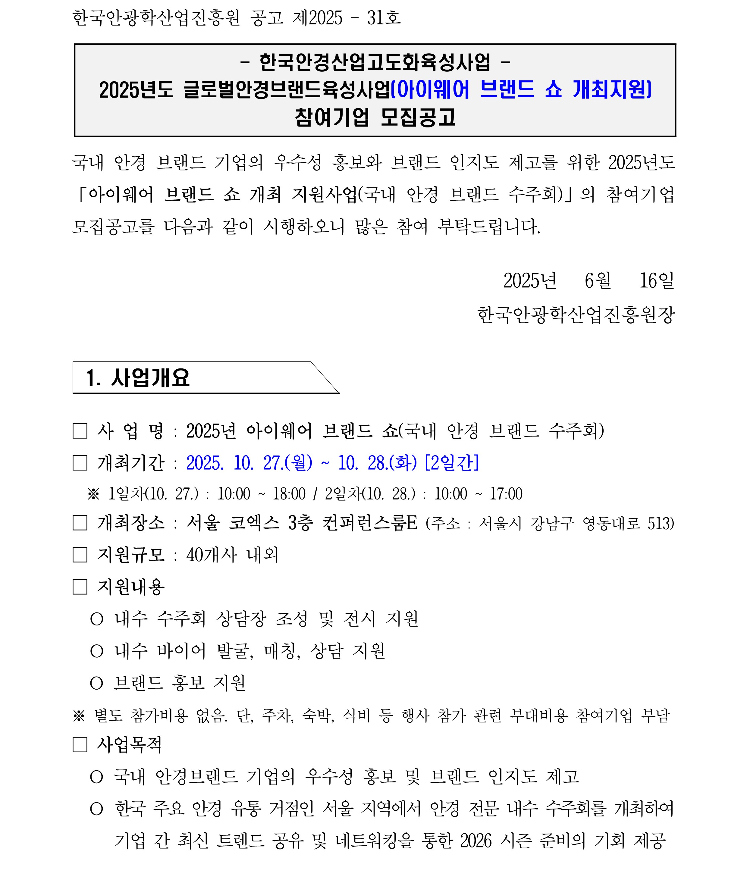 | 제목 | [한국안광학산업진흥원] 2025년 아이웨어 브랜드 쇼 개최 지원 참여기업 모집 (~6/30) | ||||