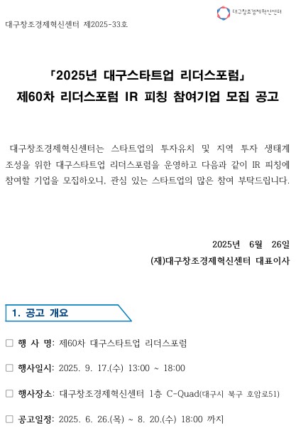 | 제목 | [대구창조경제혁신센터 ] 「2025년 대구스타트업 리더스포럼」 제60차 리더스포럼 IR 피칭 참여기업 모집 (~8/20) | ||||