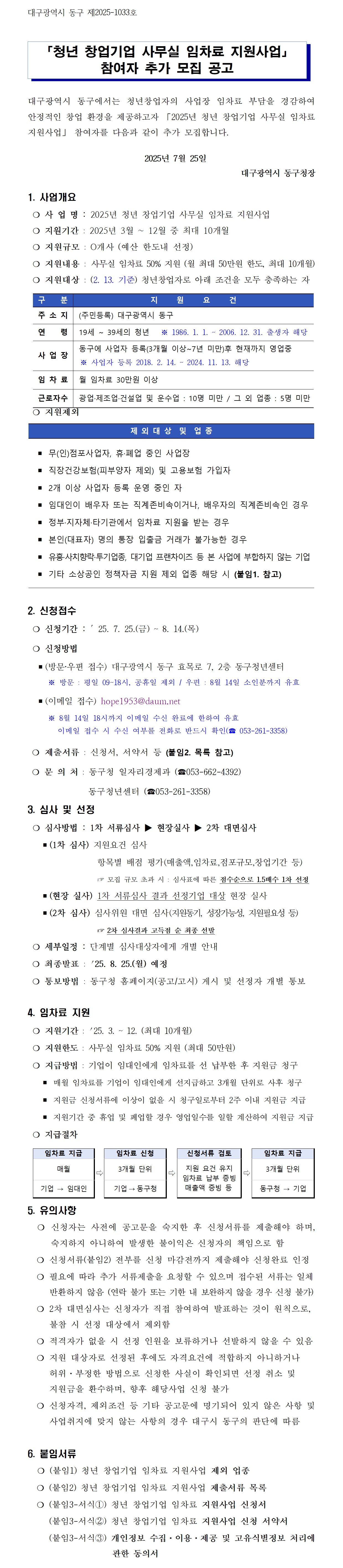 | 제목 | [동구청년센터the꿈] 동구 청년 창업기업 사무실 임차료 지원사업 참여자 추가 모집 (~8/14) | ||||