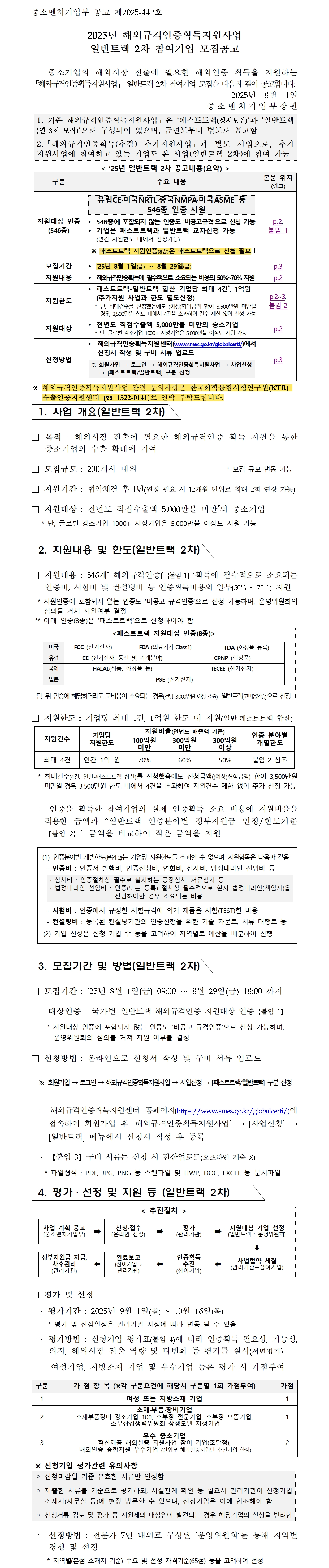 [중소벤처기업부] 2025년 해외규격인증획득지원사업 일반트랙 2차 참여기업 모집공고 (~8/29)