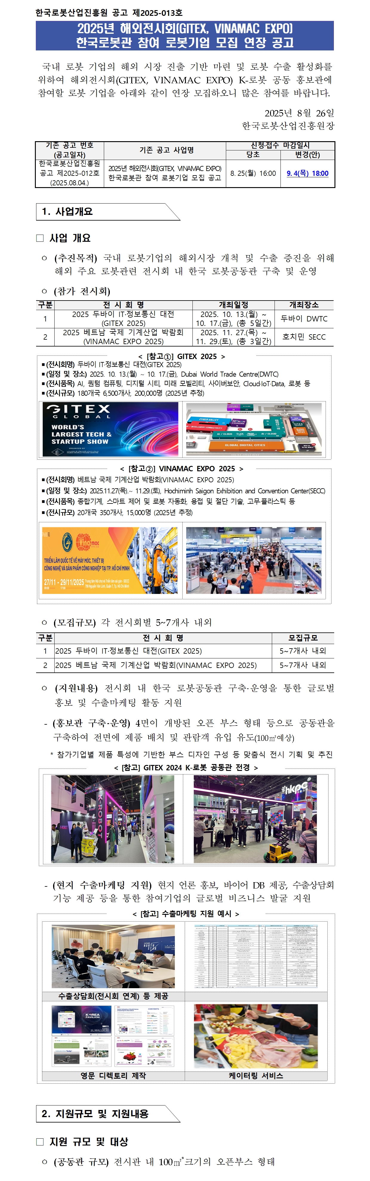 붙임1. (공고문) 2025년 해외전시회(GITEX, VINAMAC EXPO) 한국로봇관 참여 로봇기업 모집 연장 공고.hwp 붙임1. (공고문) 2025년 해외전시회(GITEX, VINAMAC EXPO) 한국로봇관 참여 로봇기업 모집 연장 공고.pdf 붙임2. 2025년 해외전시회(GITEX_ VINAMAC EXPO) 한국로봇관 구축·운영 사업 참여 로봇 기업 모집_신청서.xlsx |