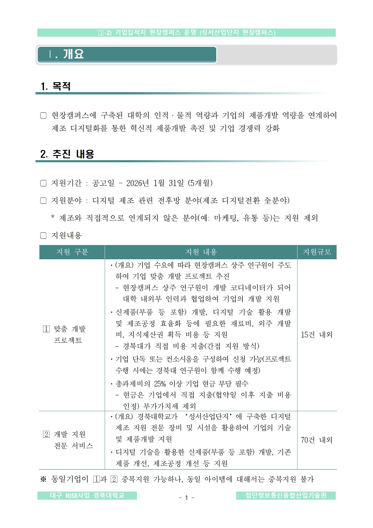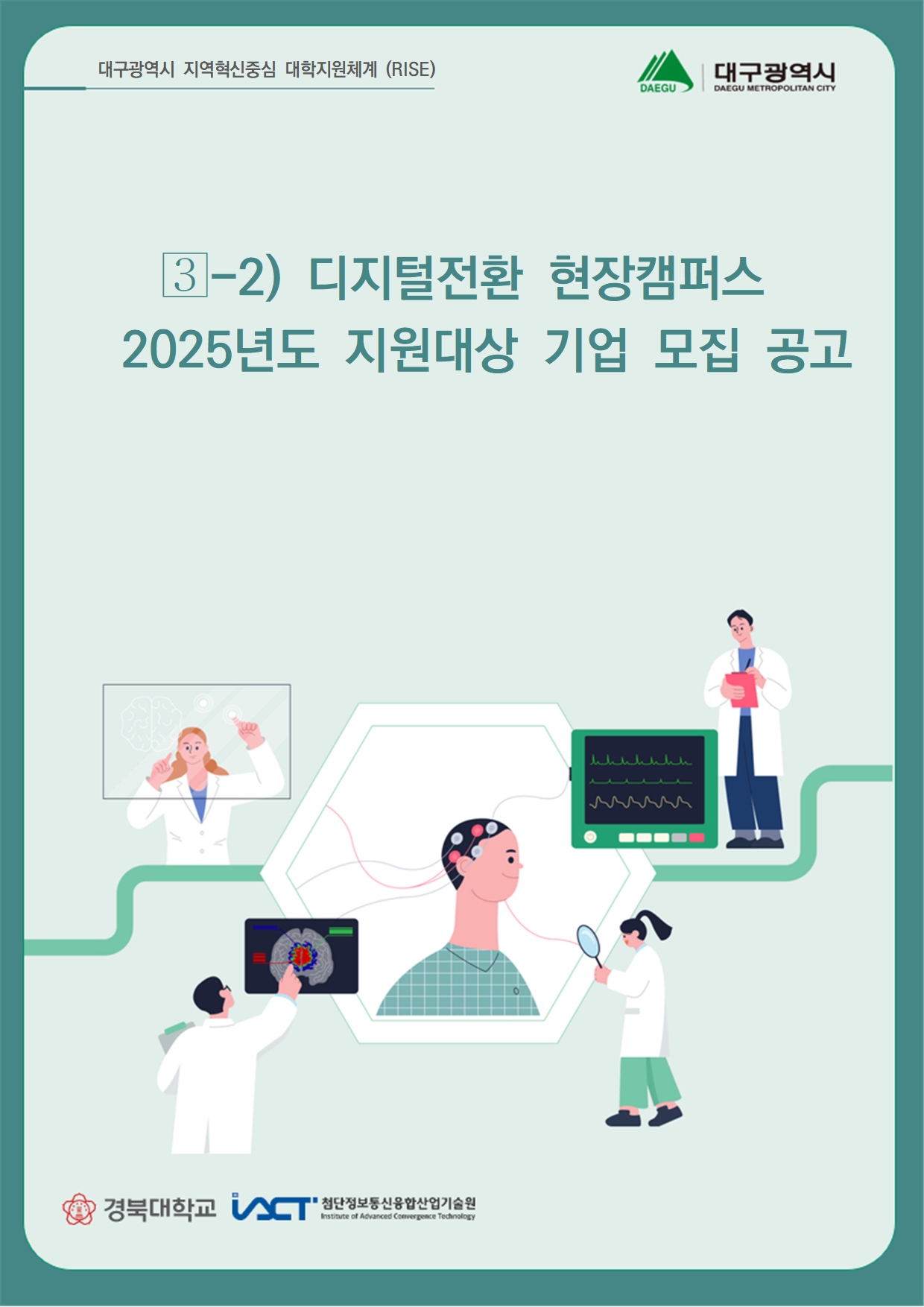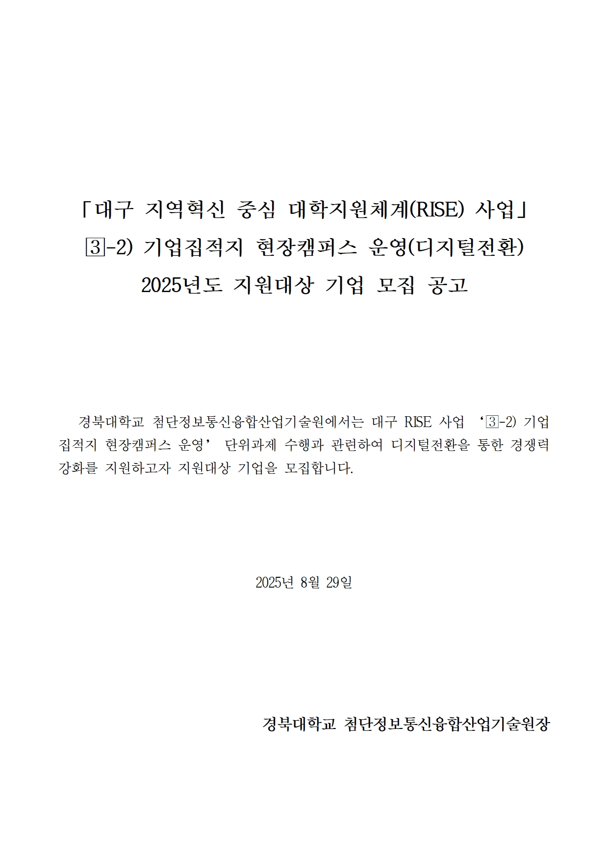 | 제목 | [경북대학교 첨단정보통신융합산업기술원] 2025년 기업집적지 현장캠퍼스 운영(디지털전환) 지원대상 기업 모집 공고 (~예산 소진 시) | ||||