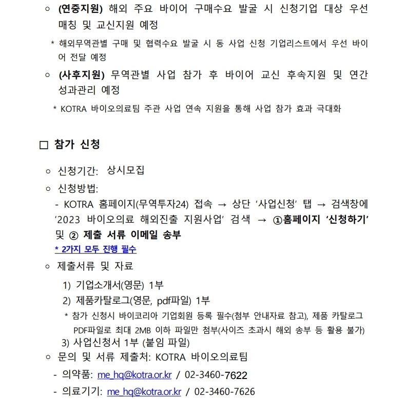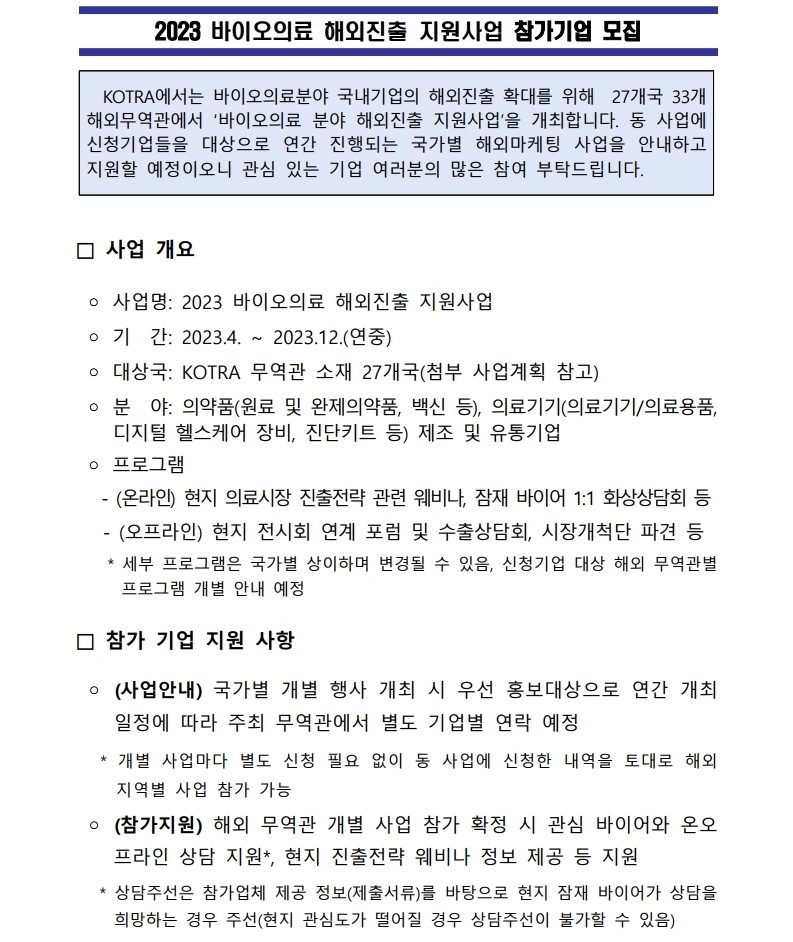 | 제목 | [KOTRA] 2023 바이오의료 해외진출 지원사업참가기업 모집 (~12/31) | ||||