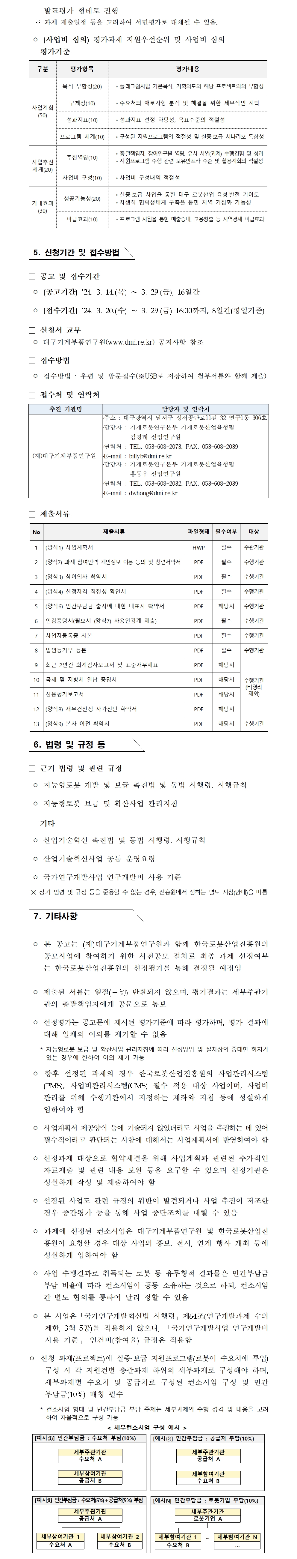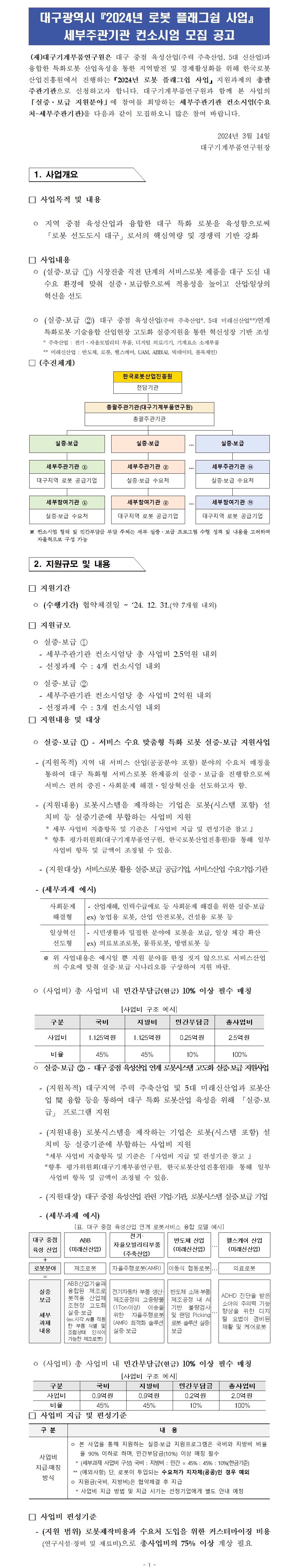 | 제목 | [대구기계부품연구원] 대구광역시『2024년 로봇 플래그쉽 사업』 세부주관기관 컨소시엄 모집 공고 (~3/29) | ||||