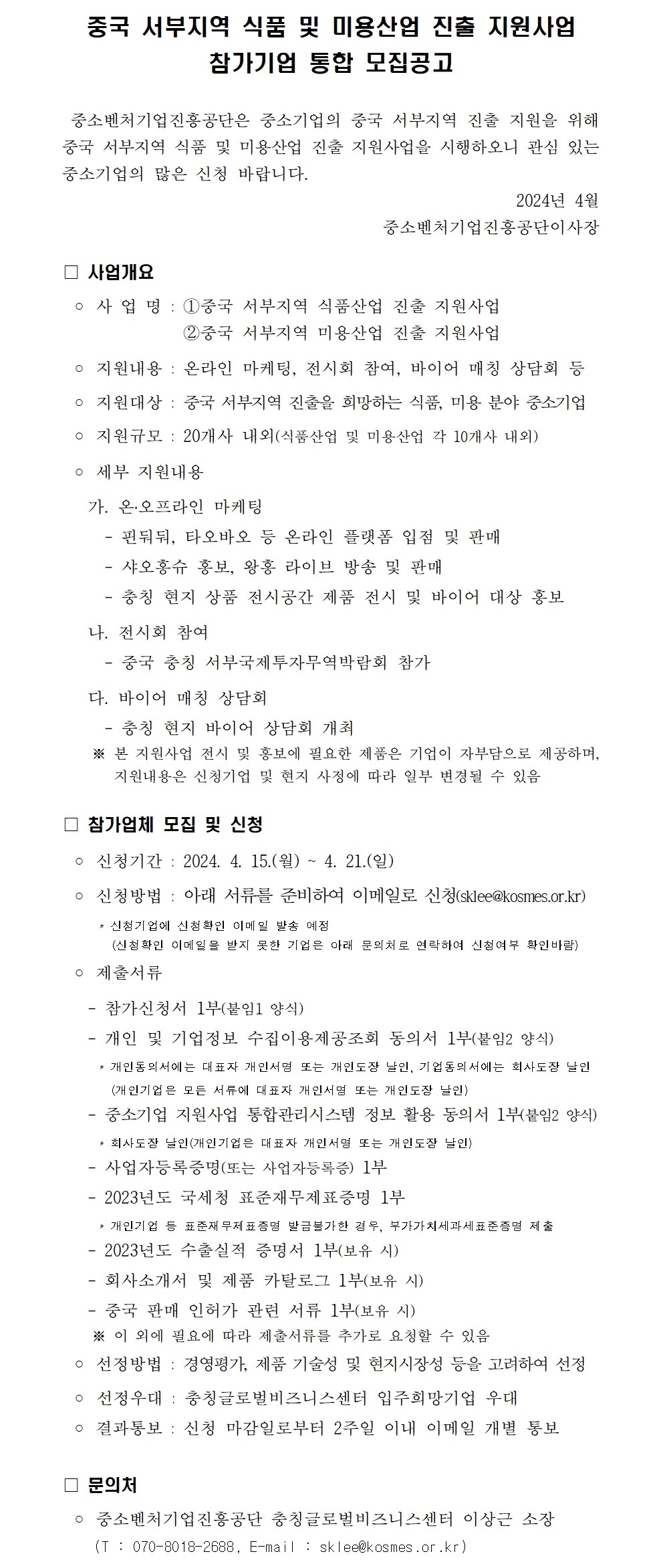 [중소벤처기업진흥공단] 중국 서부지역 식품 및 미용산업 진출 지원사업 참가기업 통합 모집공고 (~4/21)