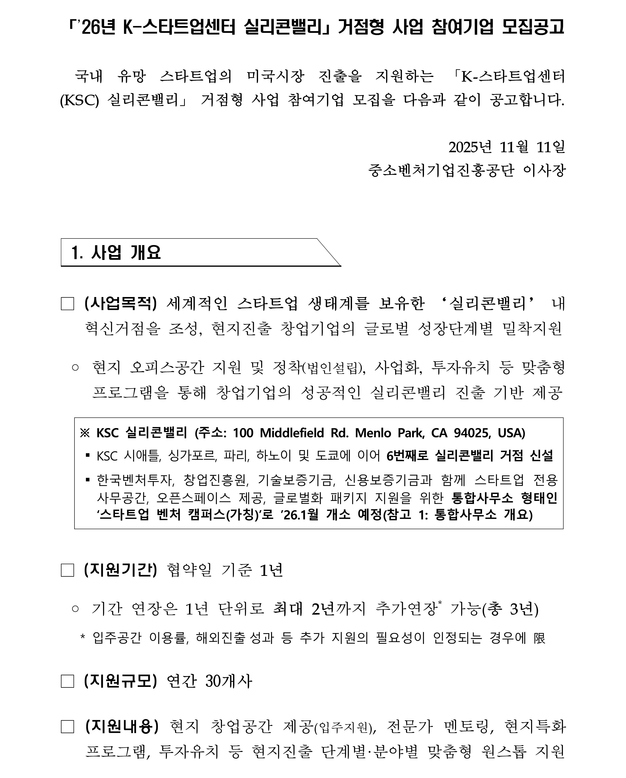 [중소벤처기업진흥공단] [코리아스타트업센터] KSC 실리콘밸리 거점형 사업 참여기업 모집공고 (~12/12)