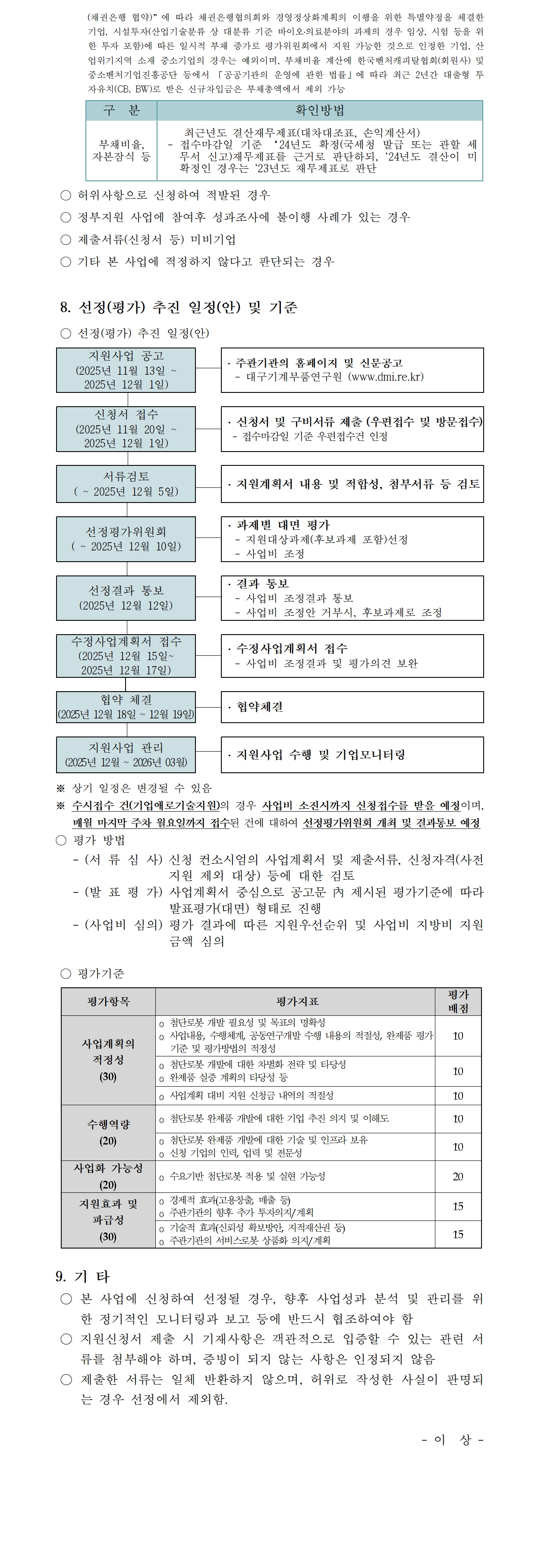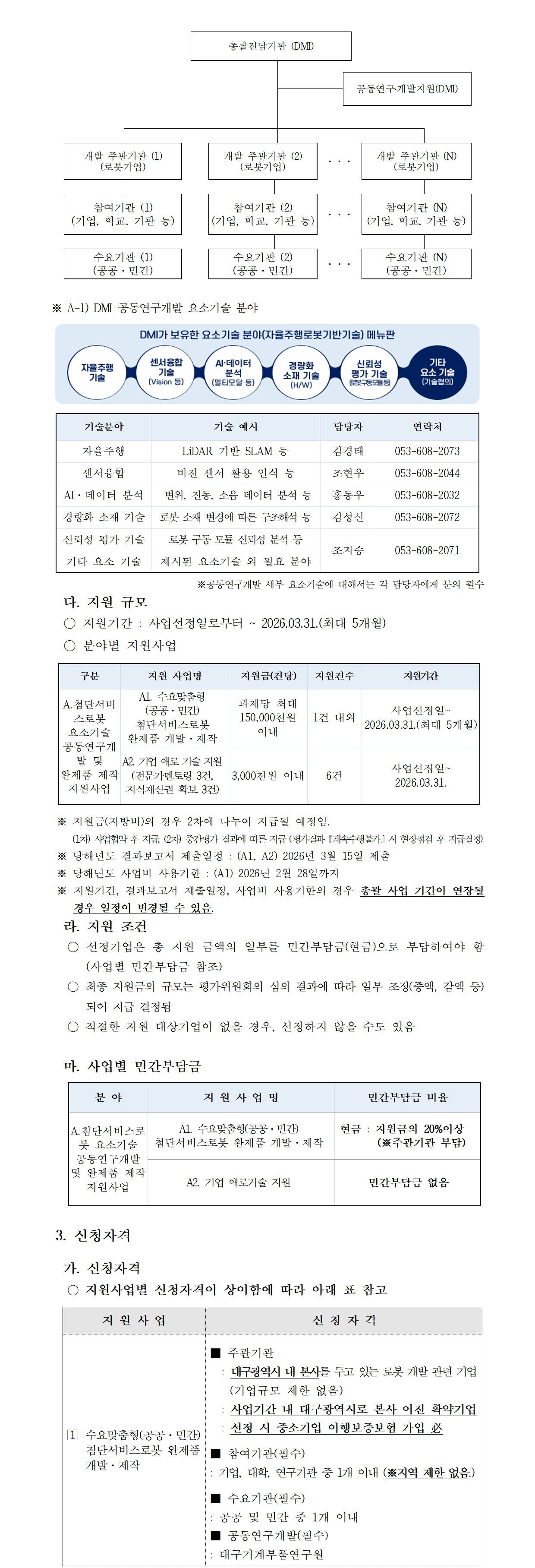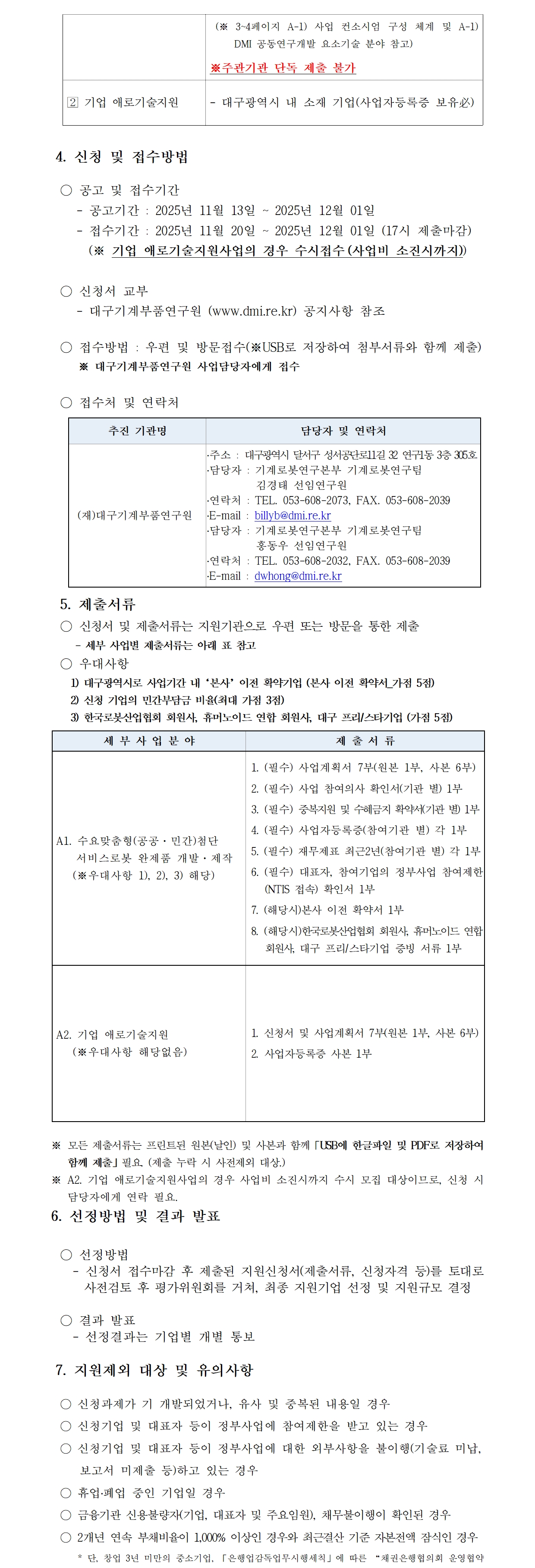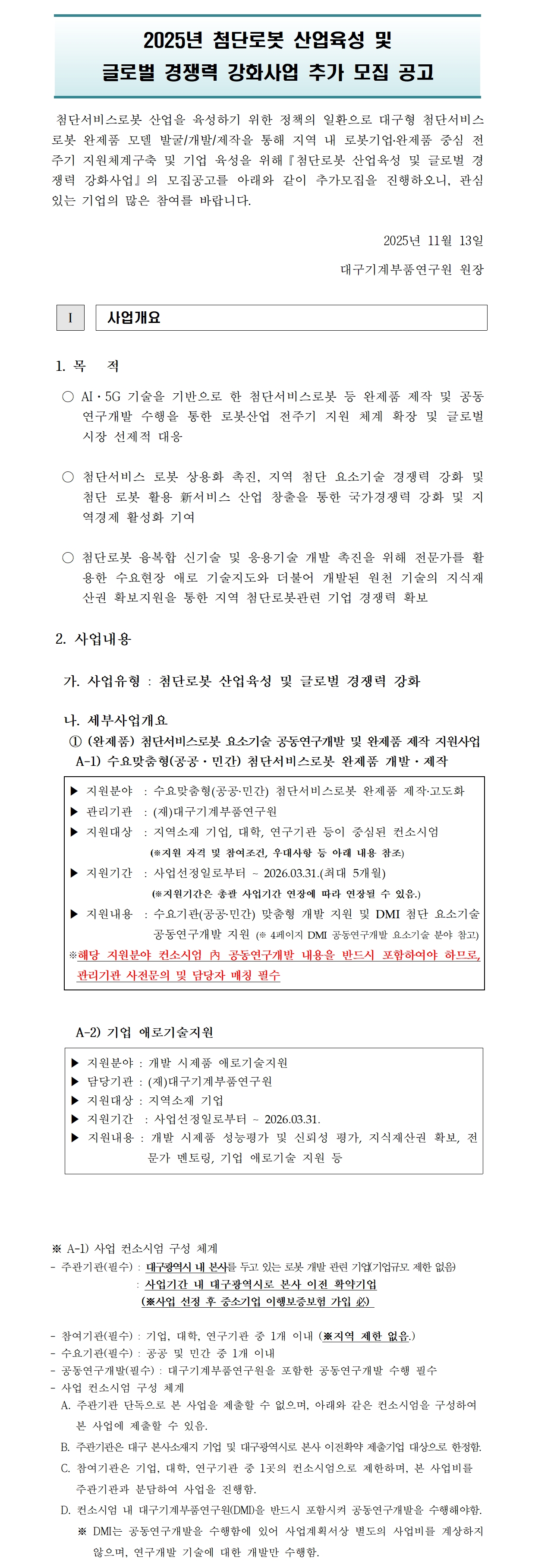 | 제목 | [대구기계부품연구원] 2025년 첨단로봇 산업육성 및 글로벌 경쟁력 강화사업 추가모집 공고 (~12/01) | ||||